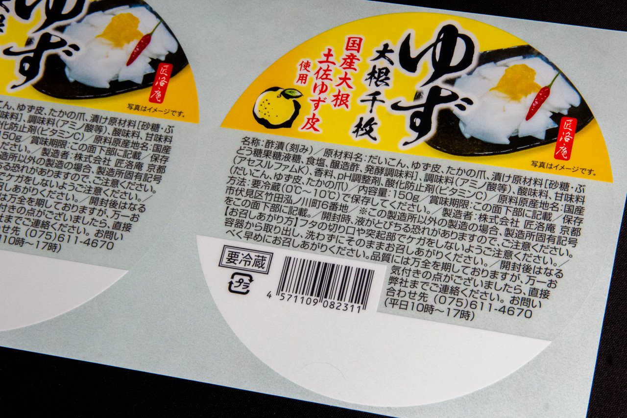 シール・ラベル実績紹介 ホーム > シール実績 > 備考 > PET > ゆず大根千枚商品ラベル ゆず大根千枚商品ラベル シール仕様 用途 商品ラベル 用紙 透明PET 表面加工 印刷 凸版5色 粘着剤 溶剤強粘 サイズ 115mm丸 仕上がり ロール仕上げ 備考 キーワード PETプロセスカラーロール仕上げ内容表示シール冷蔵食品用シール凸版5色凸版印刷商品に使用商品ラベル商品説明シール溶剤強粘漬物耐水透明PET 同仕様でのお見積りはこちらから お客様情報 名前必須 名前[ふりがな]必須 社名 社名[ふりがな] メールアドレス必須 お電話番号必須 FAX ご住所 商品情報:データについて 入稿データ 入稿データは基本的にはAdobe社Illustrator(ai)アウトライン済みです。確認用PDFも添付でお願いします。 ai、pdfデータを入稿できますデータはありませんその他 入稿形態 メールファイル転送サービスその他 商品情報:仕様について 上記実績とシールサイズが異なる場合は入力してください。 数量 上記実績と印刷の色数が異なる場合は入力ください。 用紙 ※上記実績と用紙が異なる場合は下記より用紙を選んでください。 上質紙シール(コピー用紙に近い質感の紙です。)アートタックシール(光沢が有り発色の良い紙です。)ミラーコート(キャストコート)紙シール透明PETシール(透明で耐水性があり、つるつるとした質感です。)ユポシール(水に強く破れにくい樹脂素材の用紙です。) その他 見積もり依頼の返答方法(メール以外を希望する場合) 見積り依頼内容を確認後お見積もりの返答をいたします。 基本的にはメールでの返事となりますが、ご希望があればFAX・電話での返事も可能です。 希望がありましたら選択ください。 FAX電話 Special Contents特設サイト お問い合わせContact ご相談・ご質問等ございましたら、お気軽にお問い合わせください。 06-4305-4624 月-金8:30~17:30 お問い合わせ